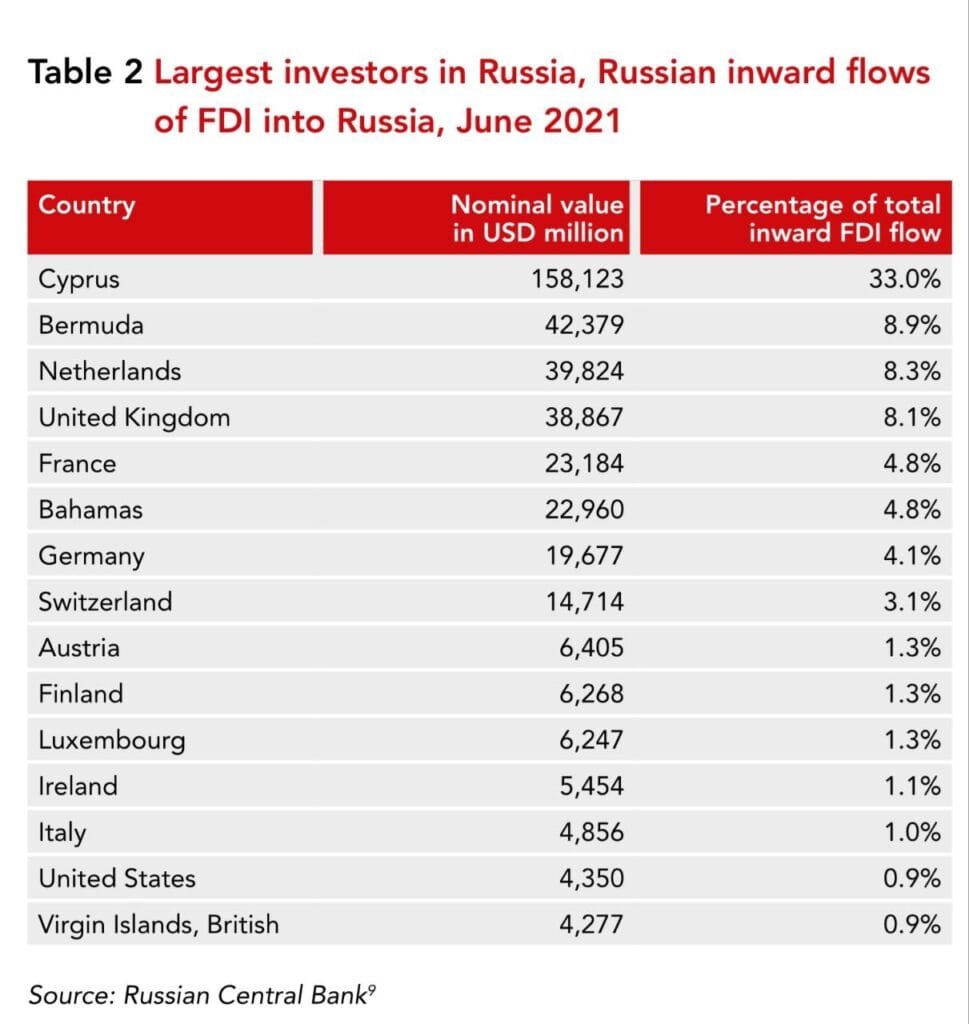 Before 2022, official FDI statistics were significantly distorted by the widespread use of European jurisdictions as conduits for Russian capital. By some estimates, 70–80 per cent of investments routed through Cyprus were ultimately Russian-owned. The Netherlands served as the legal domicile for groups such as X5, Yandex and VimpelCom, while Malta, Luxembourg, Ireland and the UK were commonly used for holding and financing structures.