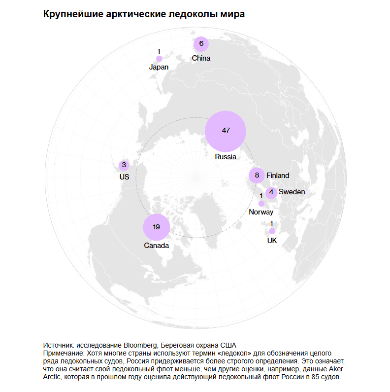Россия — безусловный мировой лидер с 47 ледоколами в строю, по данным Михаила Григорьева, директора московской консалтинговой компании Gecon. Эти суда примерно соответствуют тому, что Канада и США классифицируют как тяжёлые или средние ледоколы. Ещё 15 российских судов находятся в стадии строительства, добавил Григорьев, и заключён контракт ещё на одно.
