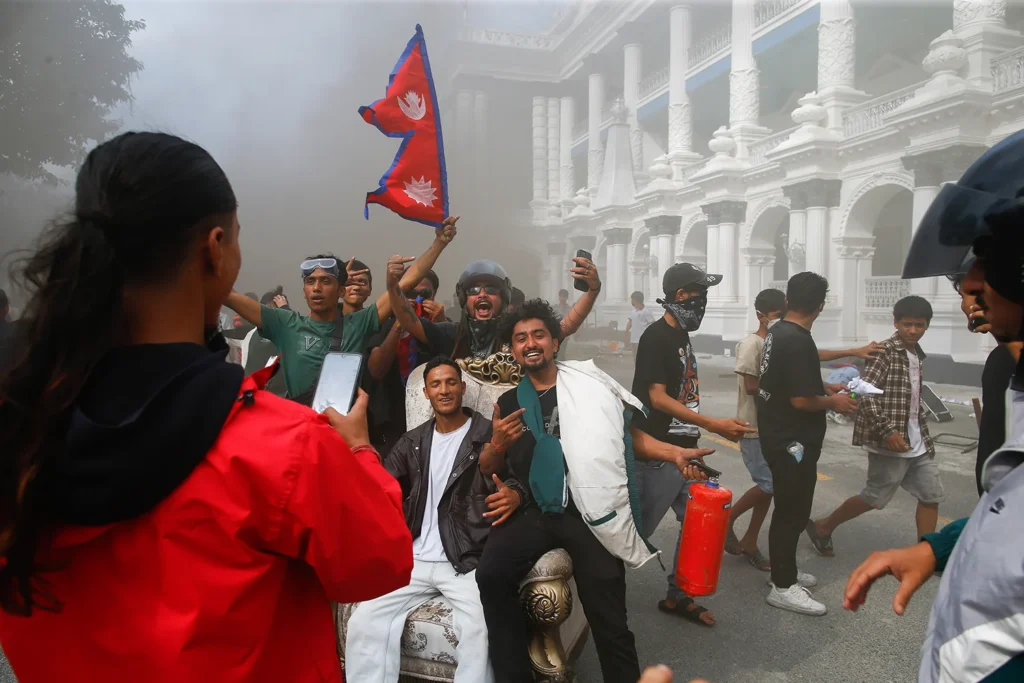 Молодые непальцы празднуют захват правительственных зданий и других министерств во время протестов в Катманду, Непал, 9 сентября 2025 года. Фото: Skanda Gautam/SOPA Images/LightRocket / Getty Images via Foreign Policy