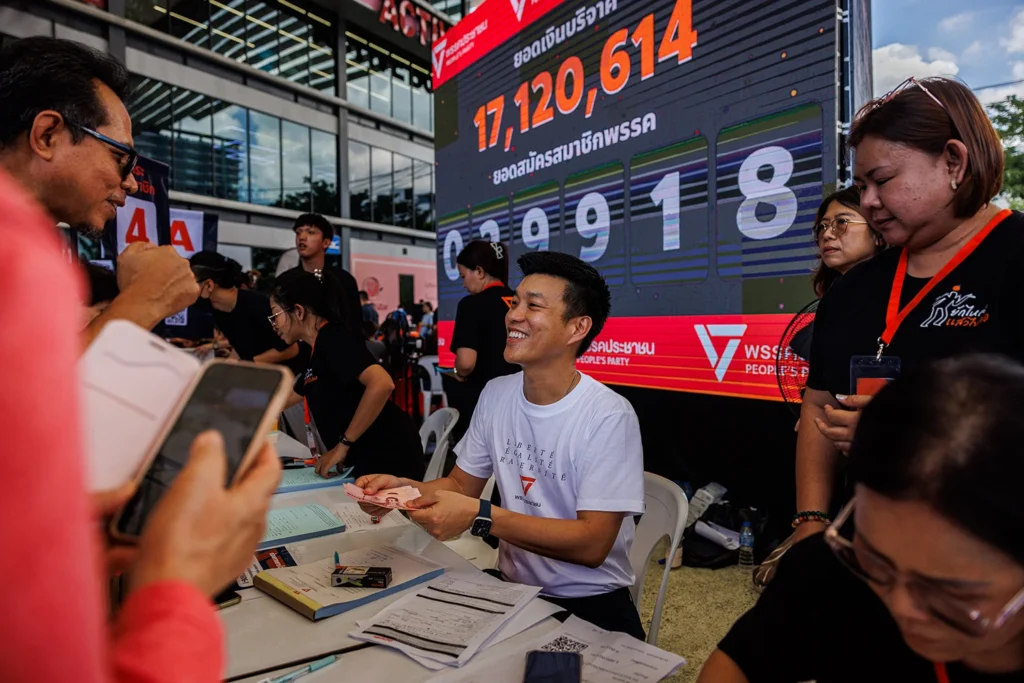 Лидер Народной партии Наттхапхонг Руенгпаньявут принимает пожертвования от сторонника на мероприятии по привлечению новых членов партии в Бангкоке 10 августа 2024 года. Фото: Лорен ДеЧикка/Getty Images via Foreign Policy